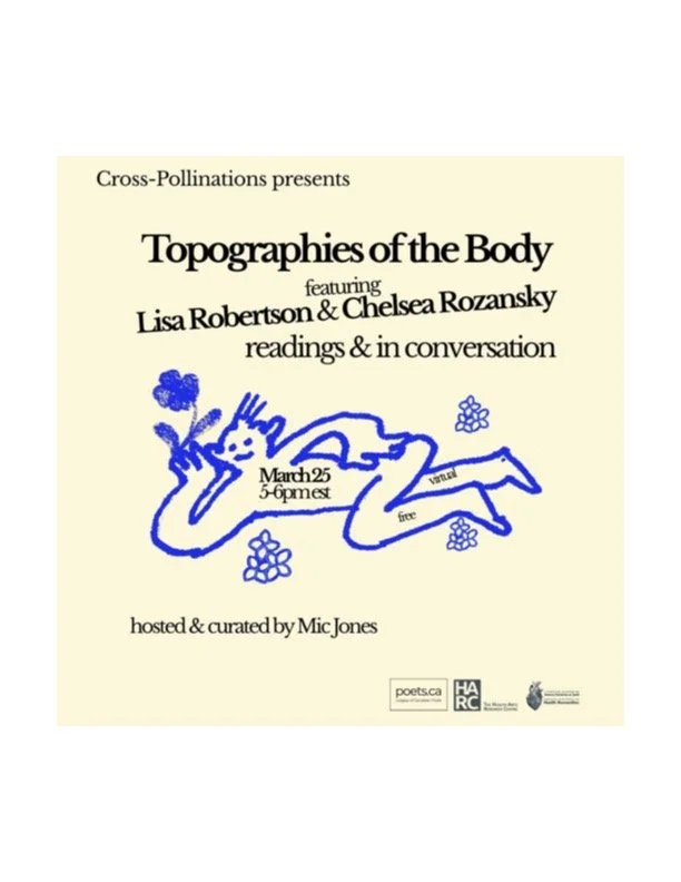 “Cross-Pollination Presents: Topographies of the Body with Lisa Robertson and Chelsea Rozansky”; curated and hosted by Mic Jones and The League of Canadian Poets, on March 25, 2026. Event details here.